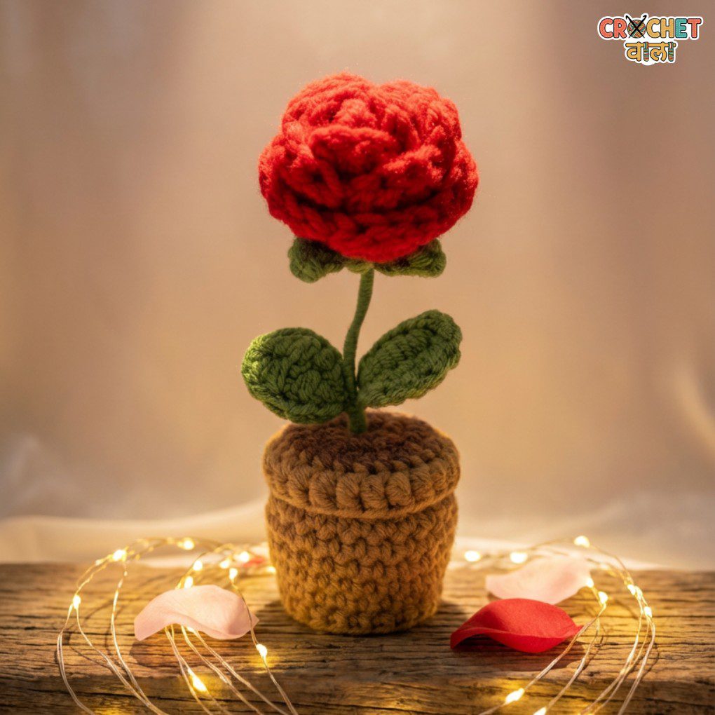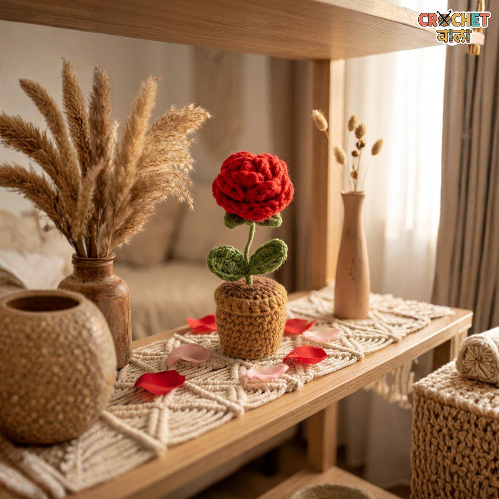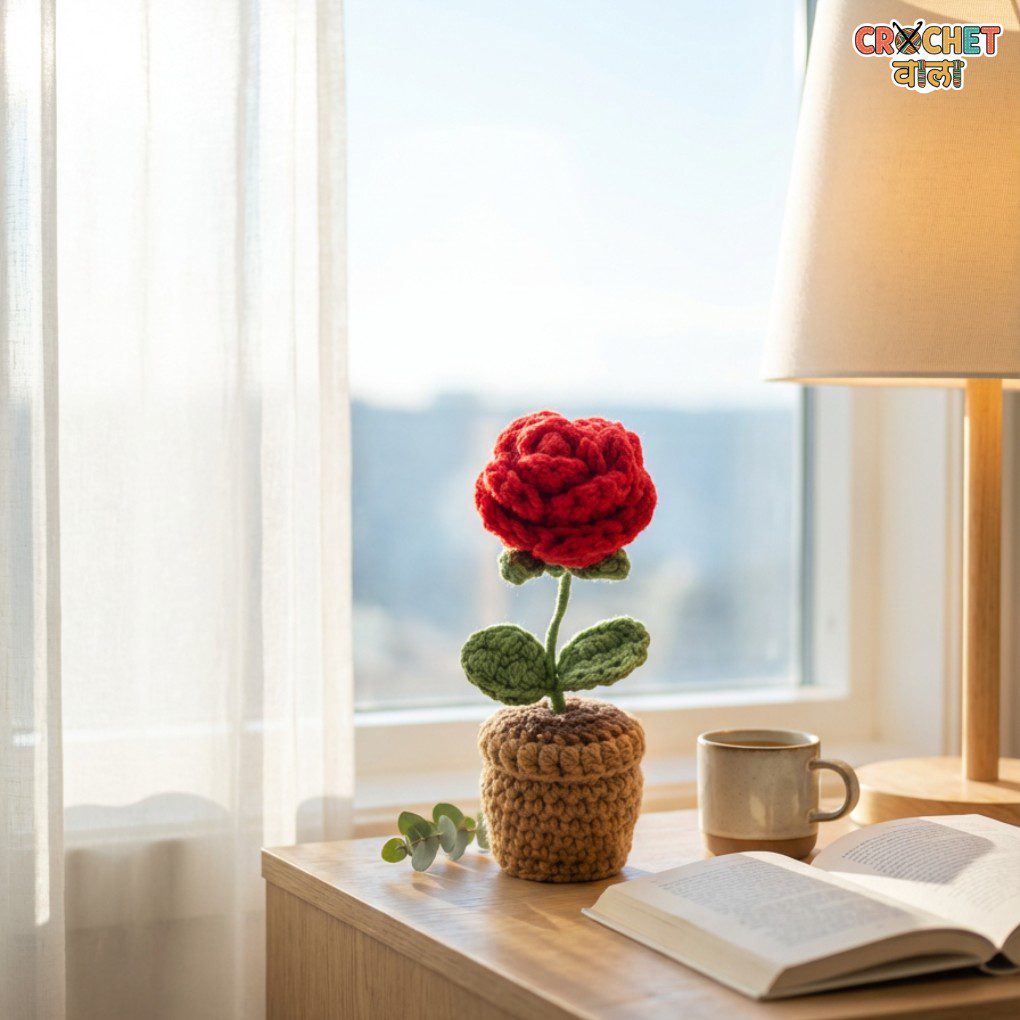 A delicately handcrafted rose pot made with premium yarn — adding timeless charm to your desk, shelf, or room décor🌹
