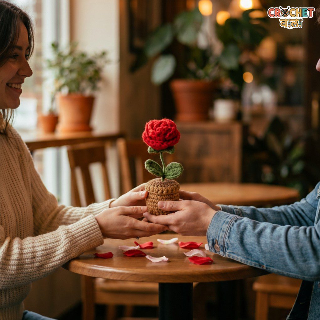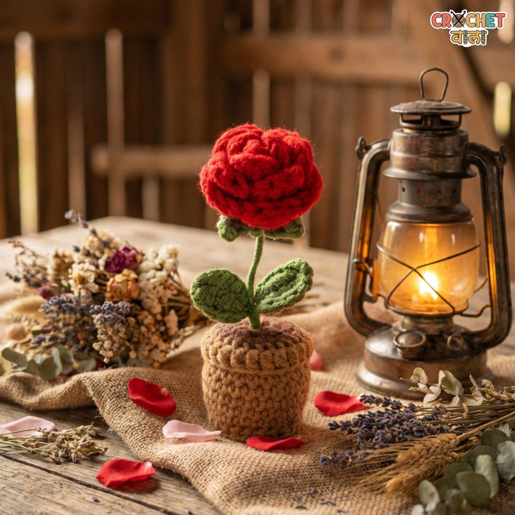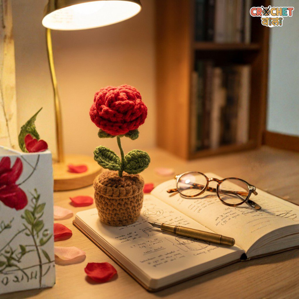 A delicately handcrafted rose pot made with premium yarn — adding timeless charm to your desk, shelf, or room décor🌹