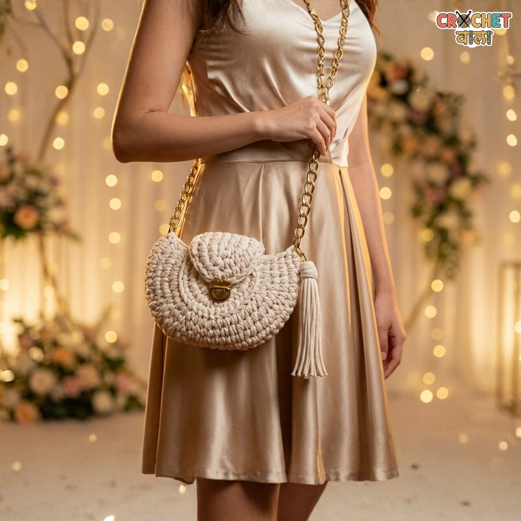 A timeless blend of elegance and craftsmanship — The Ivory Roundelle Sling is designed for women who adore soft luxury with a modern twist. Its unique round silhouette, plush handcrafted crochet texture, and refined gold detailing make it a standout piece for any sophisticated wardrobe.
